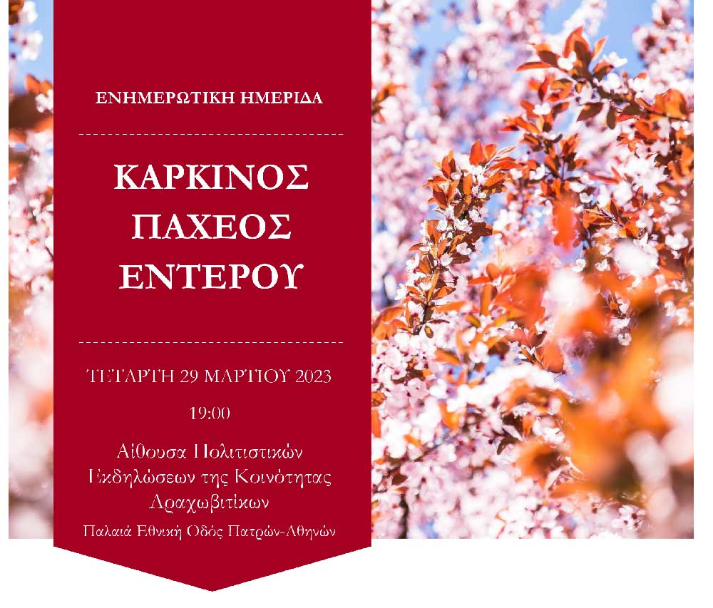 Με αφορμή το μήνα Μάρτιο, παγκόσμιο μήνα πρόληψης και ενημέρωσης για τον καρκίνο του παχέος εντέρου, ο Όμιλος Εθελοντών Κατά του Καρκίνου “ΑγκαλιάΖΩ” Νομού Αχαΐας σε συνεργασία με την Κοινότητα Αραχωβιτίκων και τον Δήμο Πατρέων διοργανώνουν ενημερωτική ημερίδα για τον Καρκίνο του Παχέος Εντέρου την Τετάρτη 29 Μαρτίου 2023, στην αίθουσα πολιτιστικών εκδηλώσεων της Κοινότητας Αραχωβιτίκων, επί της Παλαιάς Εθνικής Οδού Πατρών – Αθηνών , με ώρα έναρξης 19:00.